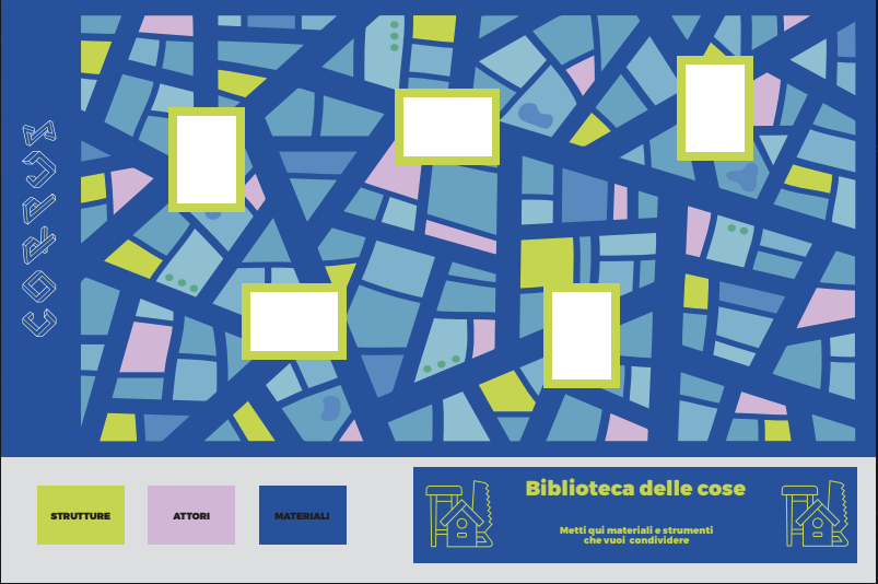 - A wider magenta square representing the space of the community lab where the library of things and materials is located. (empty at the beginning).