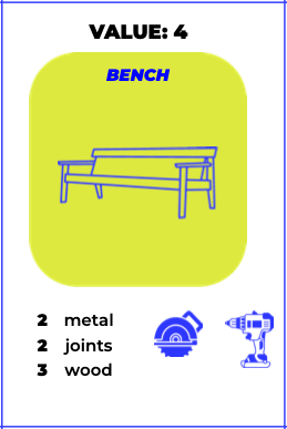 The player representing Elderly has collected all the materials cards needed to build a bench in the public space and has the tools: